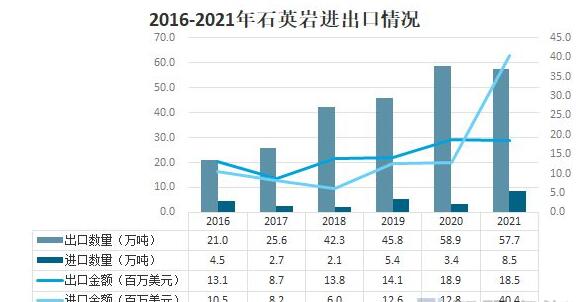 從全體上看,近兩年我國(guó)石英(天然砂在外)和石英巖(不管是否粗加修整或僅用鋸或其他辦法切割成矩形板或塊)出口量堅(jiān)持增加趨勢(shì),進(jìn)口量出現(xiàn)下滑,進(jìn)出口量存在較大差距,但進(jìn)口金額一度領(lǐng)先。2021年,我國(guó)共出口石英及石英巖115.09萬(wàn)噸,出口金額為234.75百萬(wàn)美元,共進(jìn)口石英及石英巖30.7萬(wàn)噸,進(jìn)口金額為212.46百萬(wàn)美元。