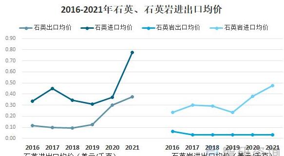 我國(guó)石英及石英巖全體進(jìn)口均價(jià)繼續(xù)領(lǐng)先,2021年進(jìn)口均價(jià)為0.69美元/千克,出口均價(jià)僅為0.2美元/千克。